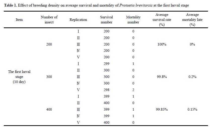 결과는 놀라웠습니다. 유충의 모든 성장 단계(1령, 2령, 3령)에서 ‘200마리’를 사육한 그룹이 99.9% ~ 100%라는 압도적인 평균 생존율을 보였습니다.